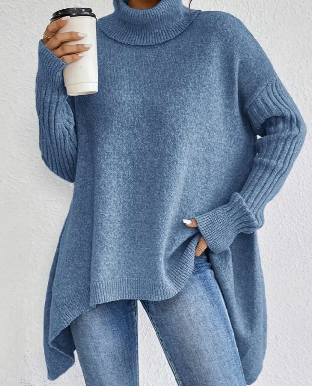 Damen Freizeit Rollkragen Asymmetrischer Saum Langarm Pullover in Uni Strick Polyester