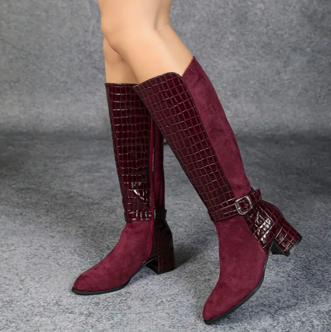 Elegante Damen-Kniehohe Stiefel, Burgunder Wildleder mit Kroko-Muster, Reißverschluss, spitze Zehen, klobige Ferse, Kunstleder, Wintermode, bequeme Passform