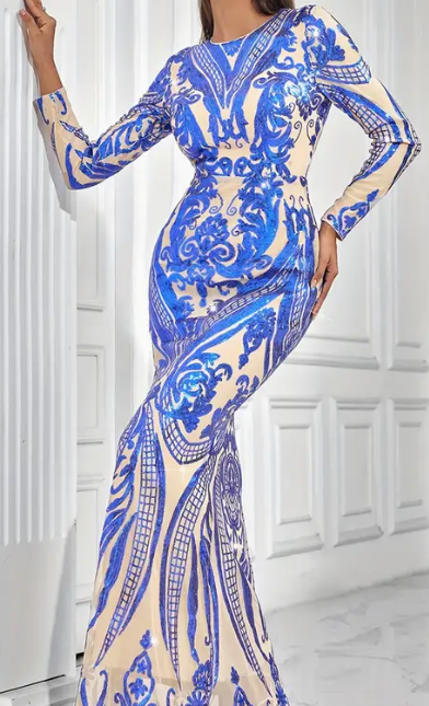 Damen Kleid in Blau Elegantes Pailletten-Meerjungfrau-Kleid – Langarm, Rundhalsausschnitt, Figurbetont mit Eingebautem BH für Frauen   Bei Bestellung angeben: Größe